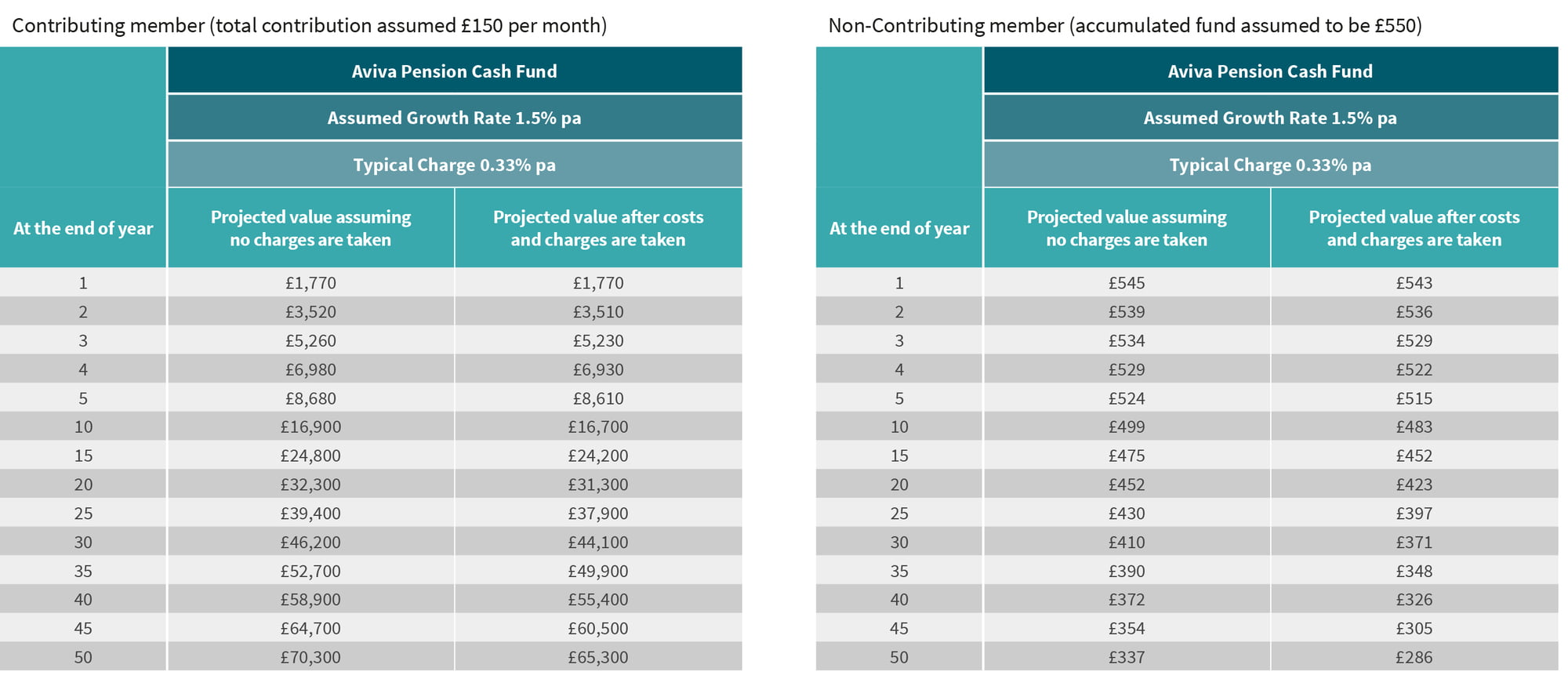 A personal projection of your pension pot is included in your annual benefit statement and you should read that to get an individual view of your projected pension benefits. You’ll also find details of the actual charges applicable to you in your scheme literature.